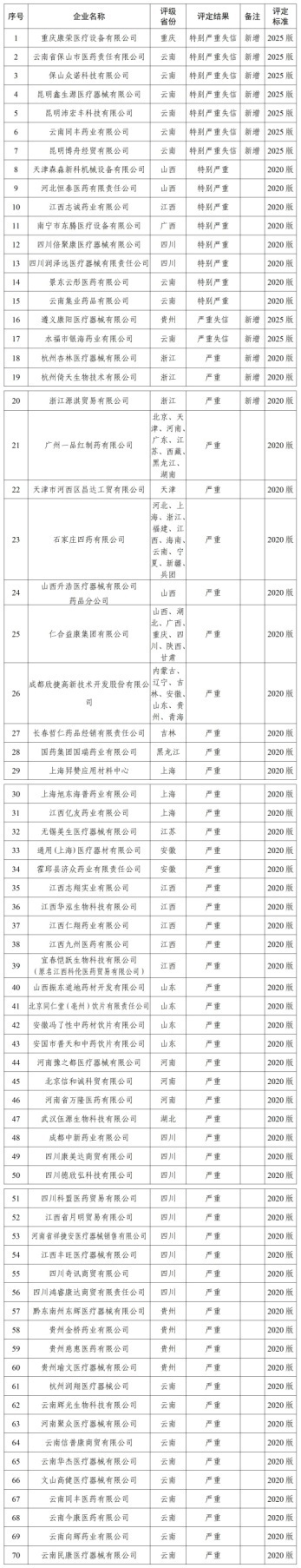 12月19日,国家医疗保障局发布第15期价格招采信用评价“特别严重(失信)”和“严重(失信)”评定结果。截至2025年10月1日,70家医药企业被各省份评级为“特别严重(失信)”和“严重(失信)”,涉及广州一品红制药有限公司、石家庄四药有限公司、通用(上海)医疗器材有限公司、山西振东道地药材开发有限公司、北京同仁堂(亳州)饮片有限责任公司、安徽冯了性中药材饮片有限公司等。
