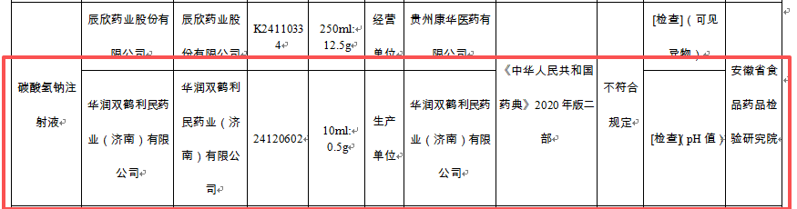 国家药监局1月6日发布的《关于28批次不符合规定药品的通告》显示,经安徽省食品药品检验研究院检验,标示为华润双鹤利民药业(济南)有限公司生产的碳酸氢钠注射液(批号:24120602)不符合规定,不符合规定项目为pH值。pH值系指氢离子浓度指数,作为酸碱程度的衡量指标。