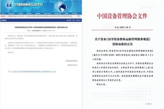 在我国医学装备产业处于高速发展期,国产设备大品牌大量涌现,医疗机构设备保有数量大幅增长,同时,医学装备运行保障服务行业正在由传统模式向专业化、标准化、数字化转型的背景下。由中国设备管理协会医疗行业分会与国药集团(上海)医学工程技术有限公司(以下简称“国药医工”)联合牵头,多家业内企业共同参与编制的《医学装备整体运维管理服务规范》(标准编号:T/CAPE 10109-2025)团体标准将于2026年3月3日起实施。