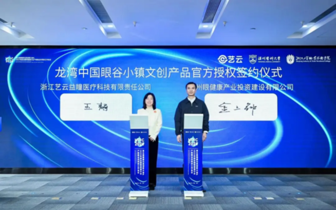 浙江艺云益瞳医疗科技有限责任公司董事长王静,与温州眼健康产业投资建设有限公司总经理金上钟达成龙湾中国眼谷小镇文创产品官方授权合作;并与瑞安市帆高光学眼镜有限公司董事长、瑞安市眼镜商会会长陈光先生签署战略合作协议。此举有助于将护眼理念以更生动的形式走向大众,进一步丰富眼健康产业发展内涵。