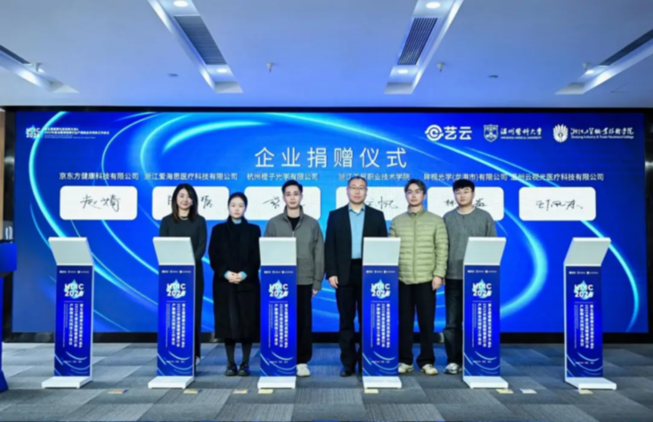 浙江工贸职业技术学院设计与数字艺术学院院长张云帆作为接收方代表,与京东方健康科技有限公司、浙江爱海思医疗科技有限公司、杭州晴美眼镜有限公司等单位代表共同参与企业捐赠签约仪式。将企业支持转化为人才培养与产业服务的实际成果。