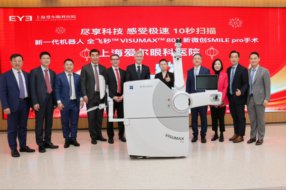 在当天举行的接机仪式上,蔡司集团总裁兼首席执行官、卡尔蔡司医疗技术股份公司代理首席执行官裴安德与爱尔眼科医院集团副总裁冯珺等双方代表共同为新设备揭幕。上海爱尔眼科医院被授予“新一代机器人全飞秒VisuMax800新微创全飞秒SMILE pro手术临床合作单位”,标志着该技术正式在本院投入临床使用。