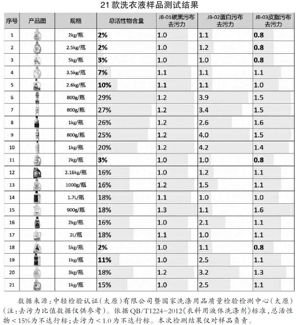 近年来,随着洗衣液市场规模持续扩大,消费者对洗衣液产品的评价不一。近日,《中国消费者报》委托中轻检验认证(太原)有限公司暨国家洗涤用品质量检验检测中心(太原),在多家电商平台采购了21款洗衣液样品,依据QB/T1224—2012《衣料用液体洗涤剂》标准开展了质量检测。