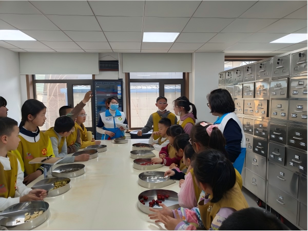 在王宝成主任团队的带领下,孩子们系统认识了辽细辛、辽五味子、关黄柏等东北特色药材,以及昆布、海藻、牡蛎等海洋中药。通过直观的展示和细致的讲解,孩子们认真观察每一味药材的形态、色泽,直观了解了药材的性味功效,并在医师的讲解下,明白了“身边的野菜、海鲜如何成为药食同源的养生佳品”。