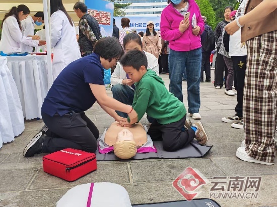 社区健康集市人气火爆,现场设置健康签到台、趣味游戏区、健康咨询区、抽奖兑换区四大板块。健康咨询区汇聚云南省急救中心、云南省疾病预防控制中心、云南中医药大学第二附属医院、云南省中医中药研究院专家,提供急救技能培训、预防接种科普、中医药知识科普、健康咨询等服务。